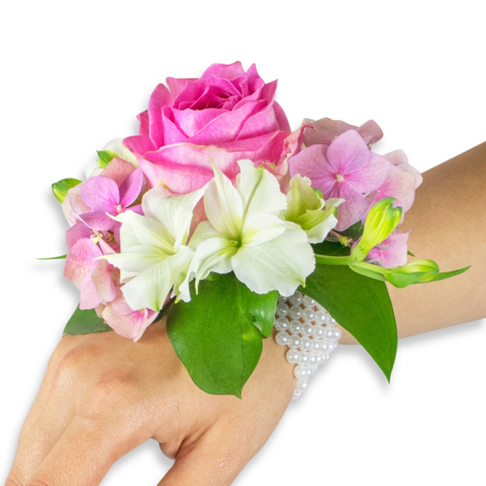 Introducing our Elegant Pink Rose & Alstroemeria Corsage, a beautiful blend of vibrant pink roses, lush hydrangeas, and pristine white alstroemeria. This unique arrangement adds a splash of color and elegance to any special dress.